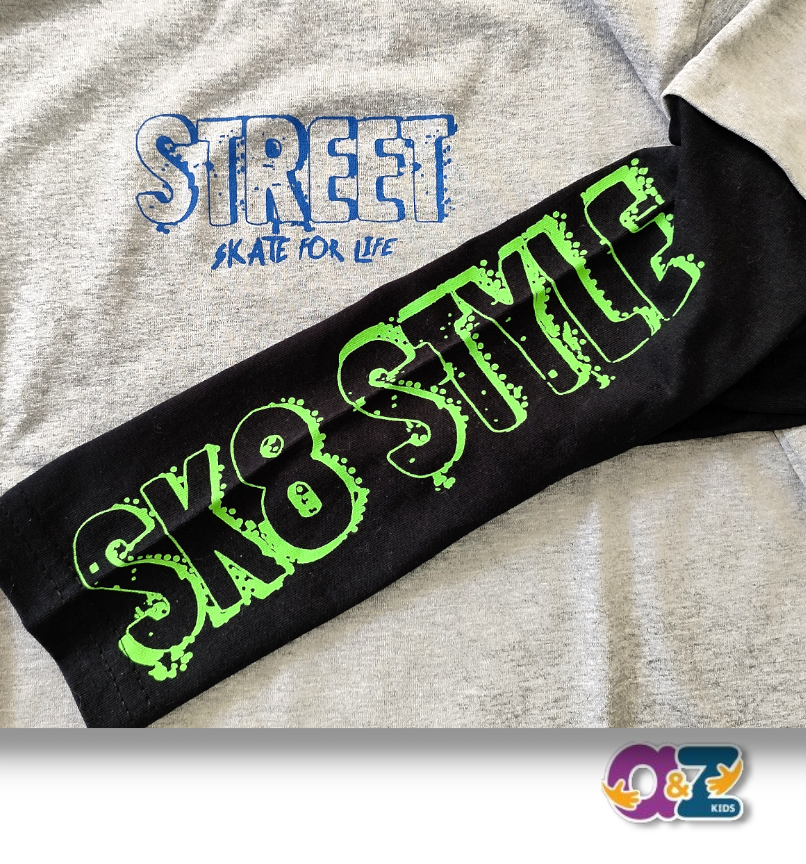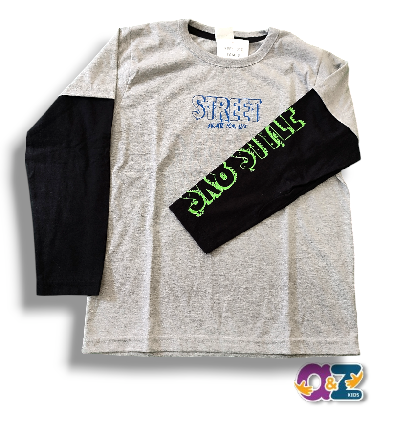 Camiseta manga longa em meia malha 52% algodão e 48% poliéster na cor cinza e mangas na cor preta.