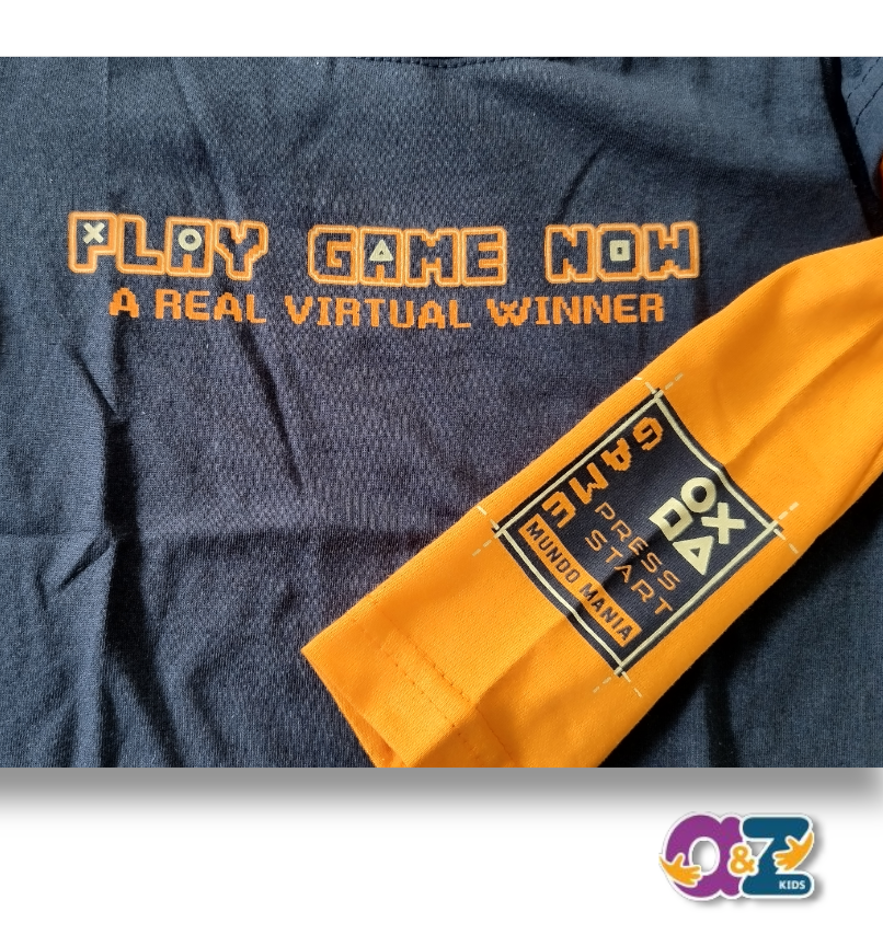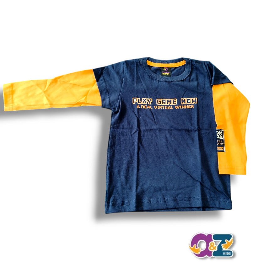 Camiseta manga longa em meia malha 100% algodão na cor azul e mangas na cor laranja.